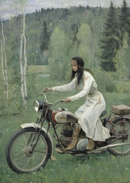 Помимо классических «Нестеровских» сюжетов, мне также было любопытно добавить в изображения современных деталей. Прописанные в промптах команды позволили добавить в картины сюжетной эксцентричности, не отходя от заданного визуального стиля. Таким образом нейросеть создала изображения ангелов, листающих смартфоны, гигантских зайцев и крестьянских девушек на мотоциклах.