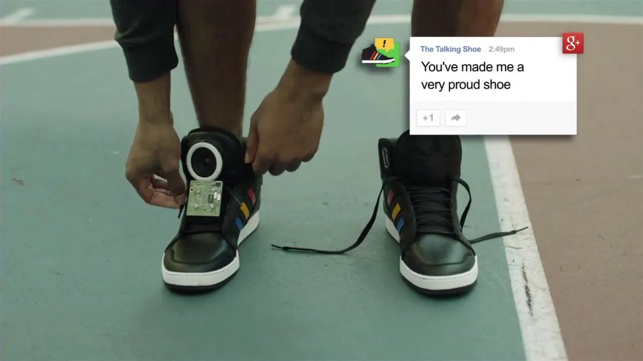 (02) Перед выходом куртки компания проводила похожие эксперименты, но с обувью: так в 2013 году появились Google Talking Shoes, которые могут разговаривать с владельцем, комментируя его активность в настоящий момент. Кроме того, они способны озвучивать комментарии на странице пользователя и посылать информацию о том, чем занят обладатель кроссовок, на его аккаунт Google+. Кстати, пара обуви была создана на основе модели кроссовок от Adidas.