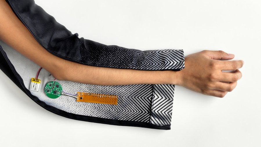 (01) Ещё одна особенность тканей, с которой экспериментируют дизайнеры — возможность встраивания стимуляторов, способных заменить тренера. Например, леггинсы Nadi X позволяют выполнять упражнения по йоге наиболее правильным образом — в них встроены биометрические сенсоры и датчики, определяющие положение в пространстве и вибрирующие, если поза выполняется не совсем верно, имитируя прикосновения, которыми тренеры обычно поправляют ошибки.