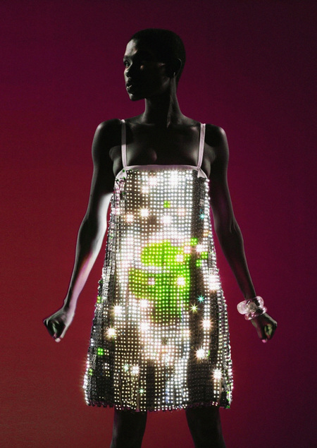 (02) Большую популярность завоевал схожий проект, представленный Adobe: на презентации платья с пайетками модель шевелила рукой, и от этих движений платье меняло паттерн. Новинка позиционируется компанией, как способ превратить одежду в настоящий холст, на котором может быть изображено, что угодно — даже проигрывающаяся анимация.