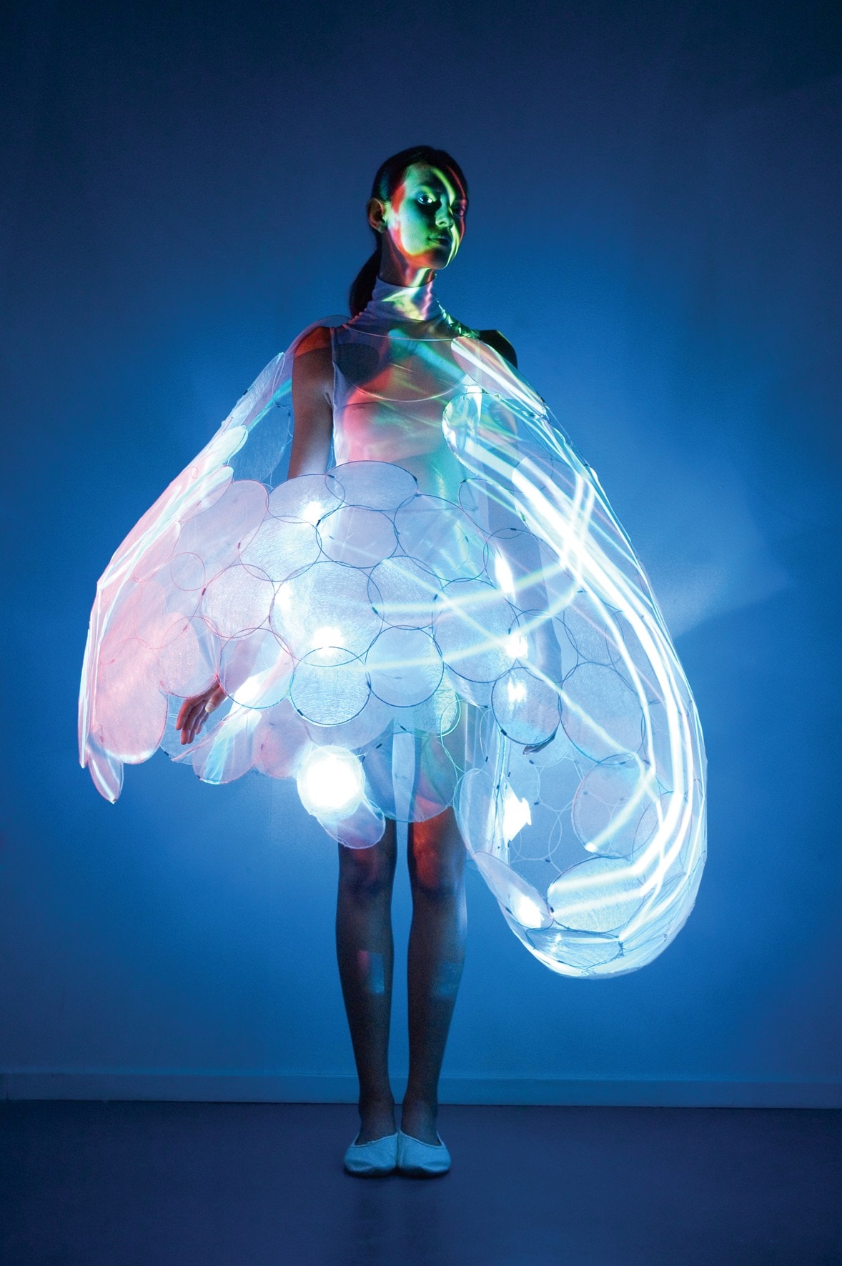 (01) Хорошим примером может быть платье Bubelle, созданное Studio XO. С ним не получится скрыть своё настроение: сенсоры, расположенные на нижнем слое платья, собирают информацию о биометрических показателях человека и отправляют её на верхний слой, ткань которого меняет цвет в соответствии с этими показателями, отражая таким образом психологическое состояние человека.
