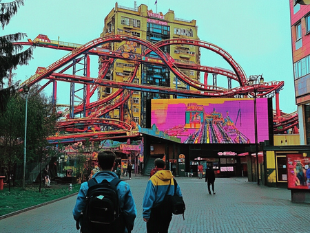 В первую очередь было придумано пространство парка. Промт состоял из слов: «park space», «cafe in a park space», «amusement park» к каждому из этих промтов было прикреплено изображение из старого проекта как стиль.