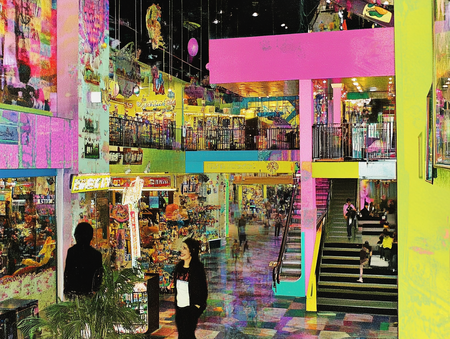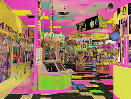 Промт торгового пространства: «shopping centre fo amusement park» + сгенерированные постеры, как стиль.