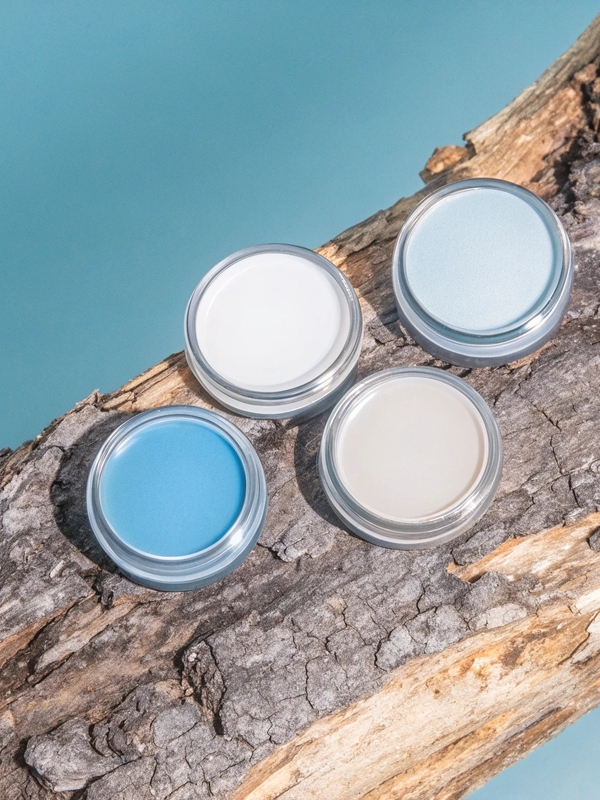 recraft.ai prompt: box with 3 little jars of solid perfume on blue fabric with pattern on lid
