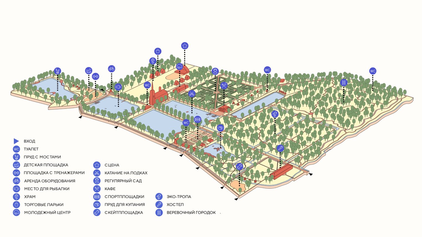 Согласно проекту, парк должен выполнять несколько функций — рекреационную, храмовую, музейную, событийную и спортивную. Его главная задача — стать новой точкой притяжения района для всех поколений жителей района и города.