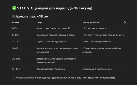 -Сценарий видеоролика приобрёл структурную и художественную глубину благодаря метафоре «перелистывания модного журнала» — это позволило выстроить повествование и задать цельную динамику видеоряда. -Визуальный стиль и обложка — генерация в Sora обеспечила эффект «печатного каталога» с характерной для Acne Studios холодной, минималистичной палитрой и плавными, кинематографичными переходами между сценами. -SEO-оптимизация статьи — при помощи ChatGPT была сформирована чёткая структура (H1–H3), внедрены ключевые слова и призывы к действию (CTA), что способствовало улучшению индексации и увеличению кликабельности. -Переходы и ритм подачи — генерация визуальных блоков с помощью Sora и Kling AI обеспечила высокое эстетическое качество и согласованность всех фрагментов видео без необходимости длительного постпродакшена.