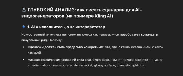 ChatGPT не только составил подробный сценарий видеоролика, но и порекомендовал подходящие ИИ-инструменты для его реализации. Перед этим я задала задачу провести анализ лучших практик написания сценариев специально для генеративных нейросетей — таких как Sora и Kling. На основе этого анализа был сформирован адаптированный сценарий, включающий указания по визуальному стилю, ритму смены кадров и характеру переходов. Такой подход обеспечил высокую согласованность между сценарием и возможностями используемых нейросетей.