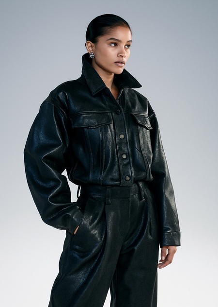 Центральным объектом коллекции стал концептуальный джинсовый костюм, залитый полимерной смолой и с вывернутыми наружу швами — образ, вдохновлённый эстетикой Гаэтано Пеше и его культовым стулом «Golgotha».