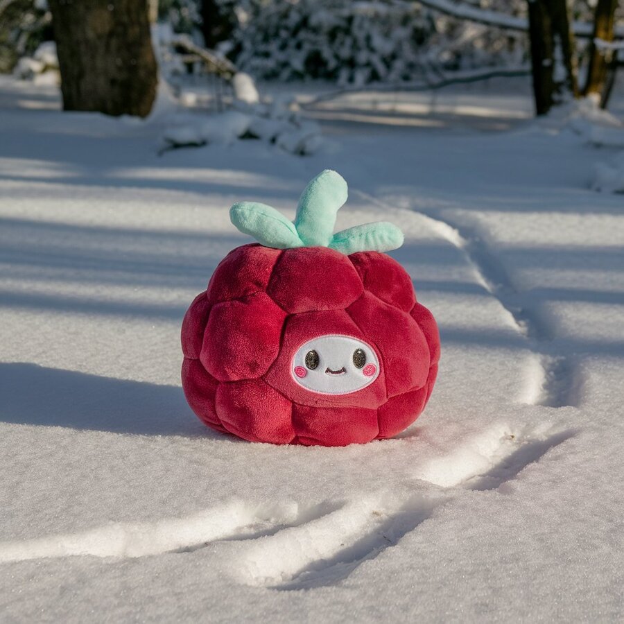 Promt 2: A photo of a raspberry-shaped plush toy with a cute face lying in the snow. The toy has a fluffy texture and is placed on a snowy ground. There are tracks leading to the toy, suggesting that an animal may have placed it there. The background contains trees covered in snow.
