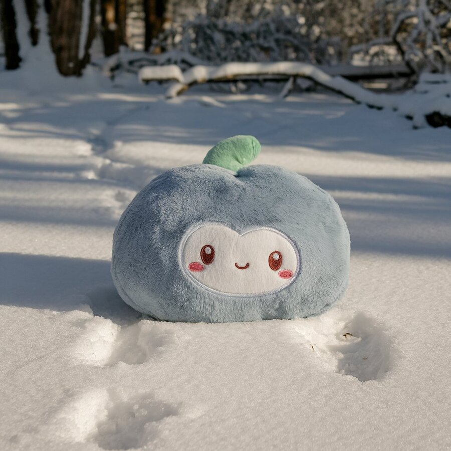 Promt 1: A photo of a blueberry-shaped plush toy with a cute face lying in the snow. The toy has a fluffy texture and is placed on a snowy ground. There are tracks leading to the toy, suggesting that an animal may have placed it there. The background contains trees covered in snow.