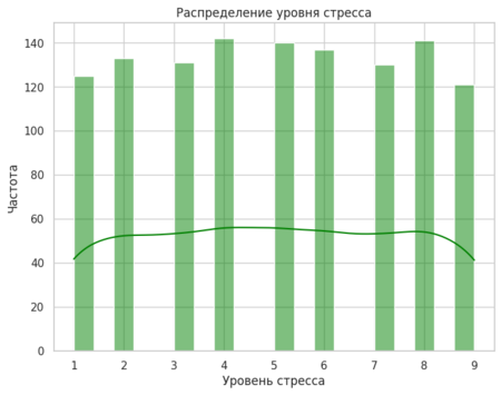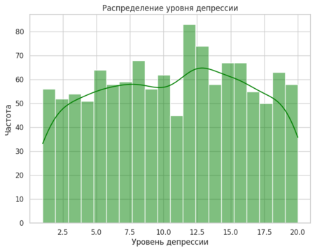 Визуализацию я начала с гистограмм, чтобы понять, как распределены уровни депрессии и стресса. Для этого я использовала sns.histplot (), добавив параметр kde=True, чтобы на графике отображалась кривая плотности. Это помогло мне увидеть, что большинство значений сосредоточено в определенном диапазоне.