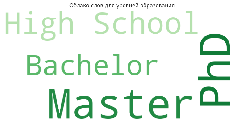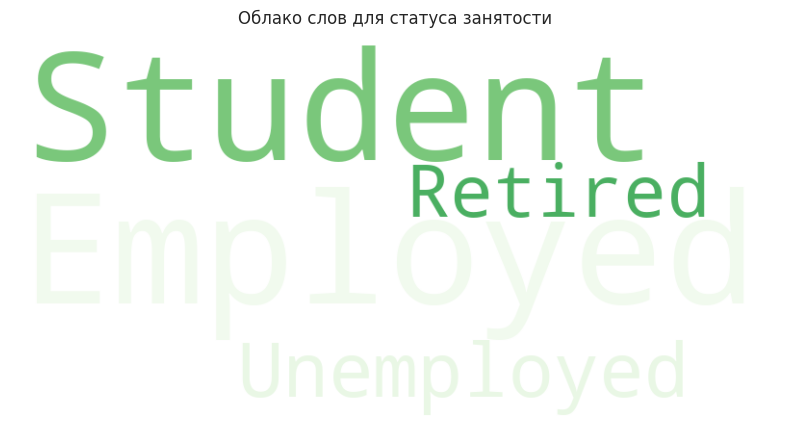 Наконец, я решила добавить облака слов, чтобы визуализировать текстовые данные. Для этого я использовала библиотеку wordcloud. Я объединила текстовые данные в одну строку и создала облако слов. Это помогло мне увидеть, какие уровни образования и статусы занятости встречаются чаще всего.