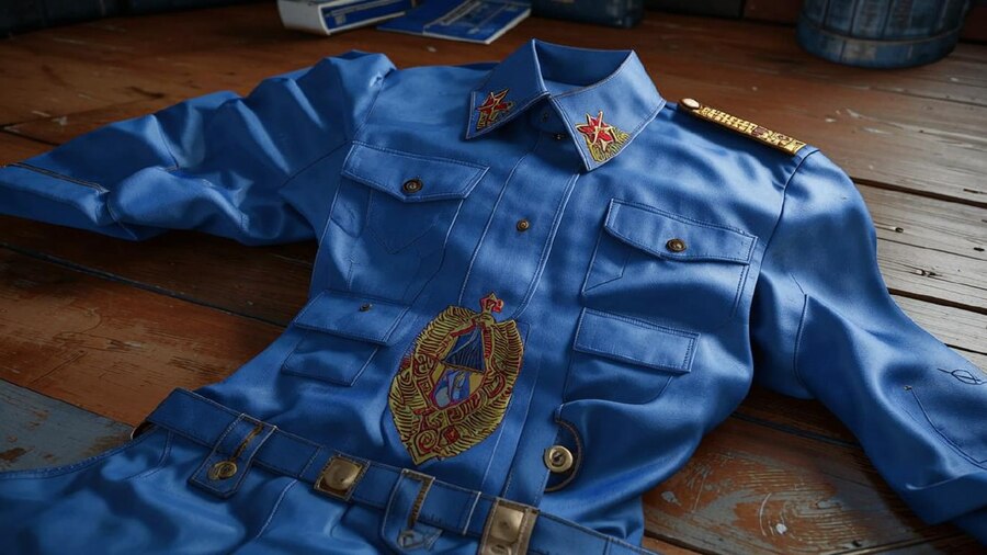 Модель: Kandinsky 3.1. Пресет: Детальное фото. Промпты: реалистичный пин с глобусом; реалистичный синий советский комбинезон мокап; реалистичный маленький счётчик гейгера.