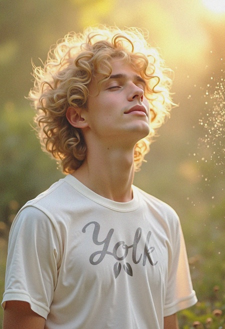 1. Promt: Create a realistic portrait of a young man with curly hair, wearing a white tank top. He is looking upward with his eyes closed, enjoying the warmth of the sun on his face and hair. His skin has a glowing, radiant sheen. The background features a natural outdoor setting with soft greenery, warm sunlight, and glowing dust particles floating gently in the air. The overall atmosphere is serene, with very delicate and light tones, creating a peaceful and dreamy vibe.