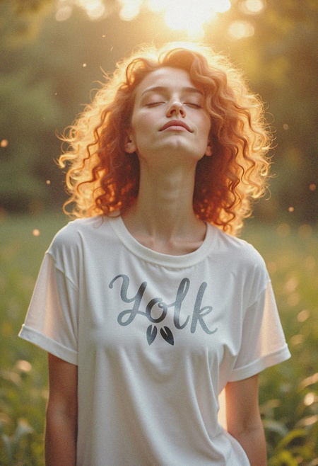 2. Promt: Create a realistic portrait of a young woman with curly hair, wearing a white tank top. She is looking upward with her eyes closed, enjoying the warmth of the sun on her face and hair. Her skin has a glowing, radiant sheen. The background features a natural outdoor setting with soft greenery, warm sunlight, and glowing dust particles floating gently in the air. The overall atmosphere is serene, with very delicate and light tones, creating a peaceful and dreamy vibe.