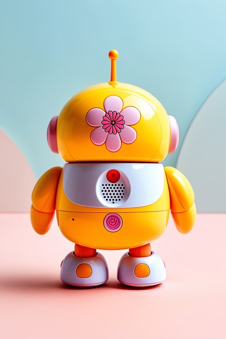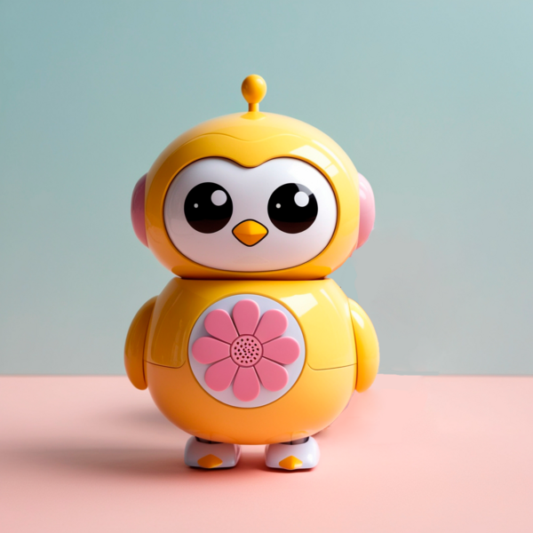 Промт для изображения слева: A cute and cartoonish robotic chick with a rounded yellow body and big expressive black eyes. The front side of the robot has a central pink button panel shaped like a flower, while the back side includes a small speaker with perforated holes. The design is smooth and glossy, with small feet and a minimalistic aesthetic. The robot appears friendly and childlike, set against a soft pastel blue background. Промт для изображения слева: Create a detailed back view of a cute and cartoonish robotic chick toy. The toy should have a round yellow body with pink highlights, including a flower emblem on the front (not visible here). The back should feature a smooth surface, small joint details where the arms and legs attach, and a round switch or hatch. The chick’s head should include a small antenna on top, visible from the rear. Use a soft pastel background in pink and light blue, similar to the original setting