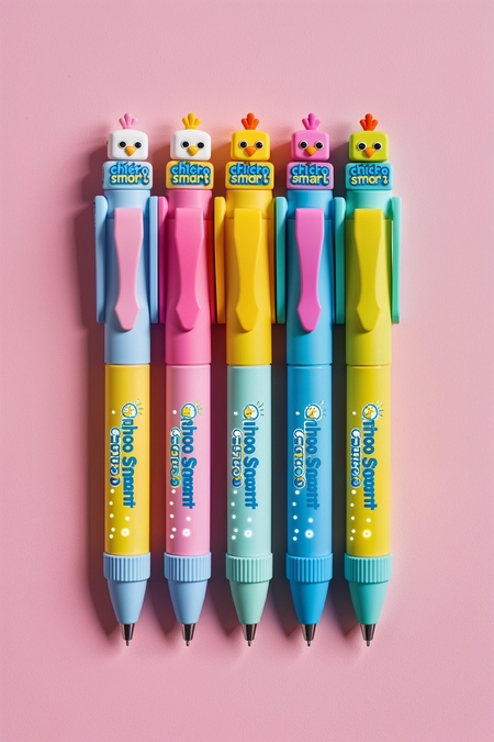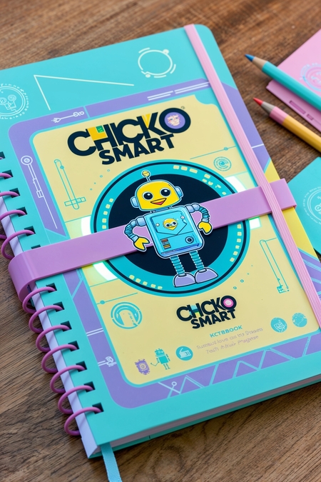 Промт для изображения слева: Create a playful and tech-inspired notebook for children, themed around the 'Chicko Smart' brand. The notebook should be A5-sized with a durable, pastel-colored cover featuring the robot chick mascot in the center, surrounded by geometric shapes and tech-style glowing accents. The cover should also include the 'Chicko Smart' logo in bold font. Add interactive features like a holographic effect on the chick or patterns that change with movement. The pages inside should be lightly lined and include small illustrations of the mascot or tech doodles in the corners. Consider including a rubber band closure in a contrasting pastel color to keep the notebook secure. Промт для изображения справа: Design a set of fun and colorful children’s pens for the 'Chicko Smart' brand. Each pen should feature a bright pastel barrel in colors like yellow, pink, blue, and turquoise, with soft silicone grips for comfort. The top of the pen should have a small 3D figurine of the robot chick mascot, designed to look cheerful and playful.