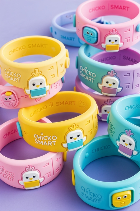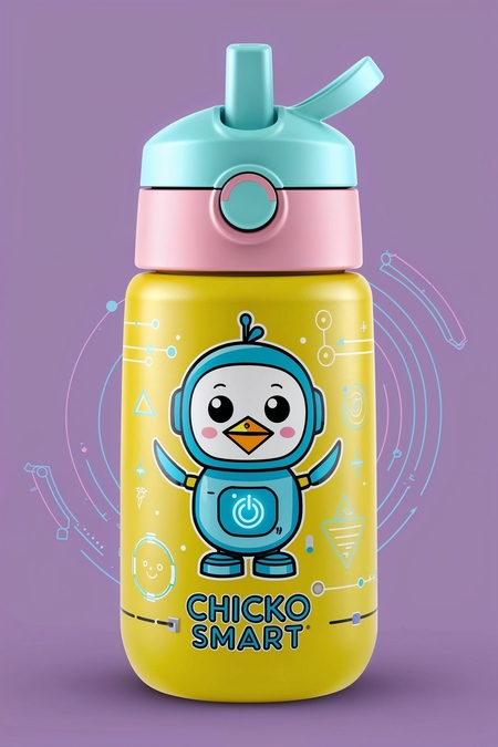 Промт для изображения слева: Design a vibrant and ergonomic water bottle for children, themed for the 'Chicko Smart' brand. The bottle should be made of lightweight, durable, and BPA-free plastic, with a bright yellow base and pastel pink or blue accents. It should feature an adorable image of the robot chick mascot with cheerful expressions, surrounded by playful geometric patterns and tech-inspired doodles. Add a flip-top lid with a built-in straw for easy drinking, and a convenient handle for portability. Промт для изображения справа: Design a set of colorful and playful children’s wristbands for the 'Chicko Smart' brand. Each bracelet should be made of soft, flexible silicone in bright pastel colors like yellow, pink, blue, and turquoise. The bracelets should feature embossed or printed designs of the robot chick mascot, geometric patterns (dots, stars, or circuits), and the 'Chicko Smart' logo in a bold, child-friendly font. Include interactive elements like tiny embedded charms shaped like eggs, chicks, or buttons that can be swapped or collected. The overall style should feel fun, tech-i