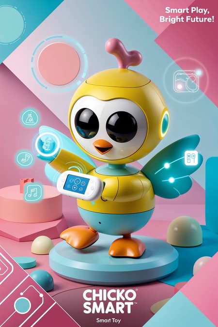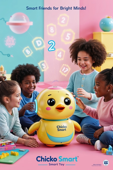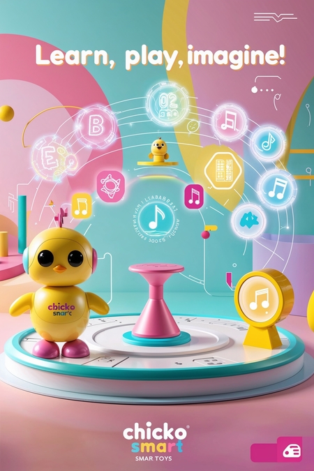 Промт: Create a lively 2D poster for the 'Chicko Smart' children’s smart toy brand. The poster should showcase the robot chick mascot standing on a futuristic learning platform, surrounded by glowing holographic projections of educational icons—like a floating alphabet, numbers, shapes, and music notes. The chick should have simple, rounded features with a bright yellow body, shiny black eyes, and cheerful pastel pink and blue accents, giving it a friendly and approachable look.