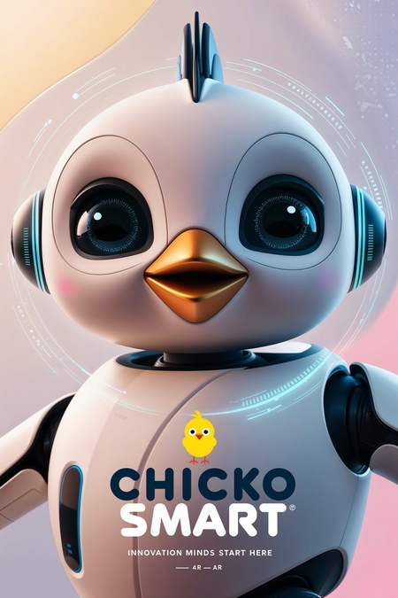 Промт: A vibrant and futuristic poster for 'Chicko Smart', featuring an adorable robot chick helping a curious child solve a puzzle or learn something new. The poster highlights the smart and educational nature of the brand, with soft pastel tones and glowing, tech-inspired details like circuits, holographic elements, and futuristic light effects. The child and the robot chick are shown interacting in a warm, playful setting, emphasizing collaboration and learning. The poster includes the brand name 'Chicko Smart' in a modern, friendly font, with a tagline like 'Learning Together, Growing Smarter' or 'Smart Fun for Bright Minds.