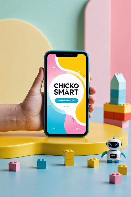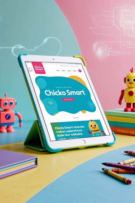 Промт: Create a playful and colorful mockup for a tablet displaying the 'Chicko Smart' brand website. Position the tablet on a bright, kid-friendly table with pastel colors and textures, surrounded by elements like crayons, books, and a robot chick mascot figurine. Include subtle tech-inspired patterns or glowing holographic effects in the background for a futuristic touch. Angle the tablet slightly to make the screen design stand out, ensuring a clear focus on the layout overlay