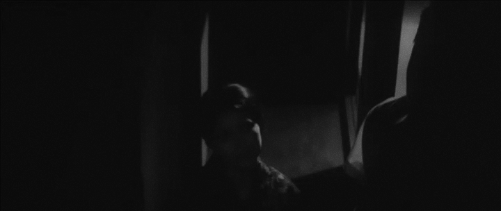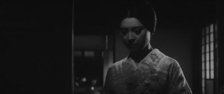 Помимо создания интриги, игра светом и тенью используется Ёсидой для подчеркивания ключевых моментов сюжета. Так, в «Истории, написанной водой» сцена прощального поцелуя Сидзуки и ее умирающего мужа сопровождается постепенным затемнением кадра до полной черноты (илл. 21), символизируя смерть и конец истории одной любви. Аналогично, постепенное погружение лица Сидзуки в тень в сцене, где она утешает сына (илл. 22), намекает на её скорую смерть.
