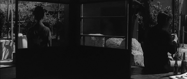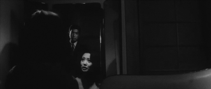 В разделенном пространстве персонажи могут перемещаться, символизируя изменение их взаимоотношений. Например, перед любовной сценой, нерешительная Орико пытается избегать близости с мужчиной, перемещаясь в отдельную пространственную зону (илл. 9), подчёркивая своё нежелание, опасение или или неготовность на сближение. В «Женщине с озера» наблюдается противоположная ситуация: Мияко и Китано находятся в одном пространстве (илл. 10), что подчёркивает их близость.