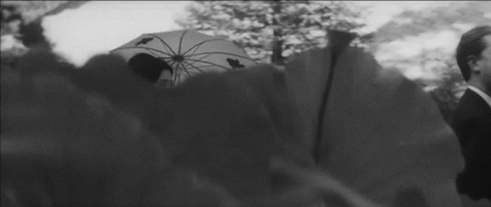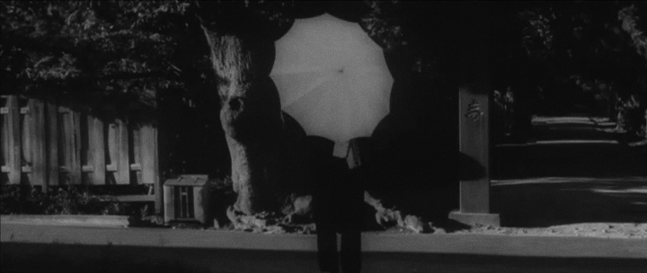 Начиная с «Истории, написанной водой», в фильмах Ёсиды появляется рекуррентный мотив женщины с зонтом, прогуливающейся по улицам города или в природном ландшафте. Этот образ выполняет не только эстетическую функцию, но и несёт смысловую нагрузку. В «Истории, написанной водой» появление Сидзуки с зонтом становится столь частым, что сам зонтик превращается в её визуальный атрибут. Его наличие на балконе гостиницы немедленно указывает на присутствие Сидзуки (илл. 28), а плавающий на воде зонт в финале — на её гибель (илл. 29).