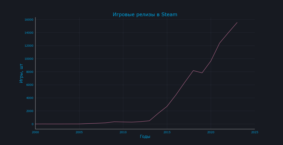 Линейный график дает нам понять, что примерно в 2013 году активно начали увеличиваться количество игровых релизов Steam, и на 2024 год их число превышает 15000, что говорит о активном росте платформы, игр выпускается все больше и больше.