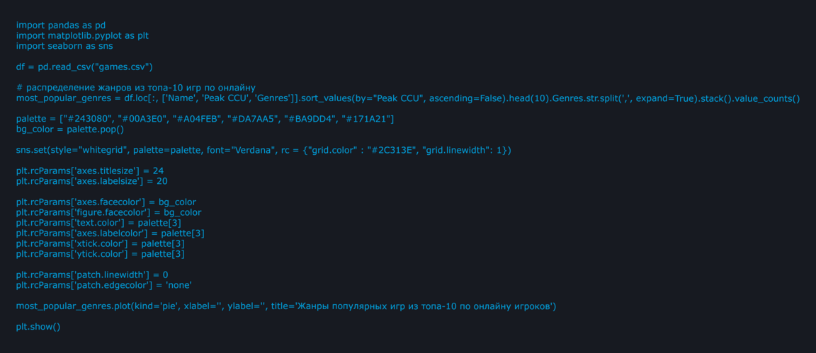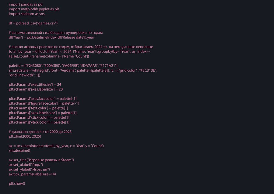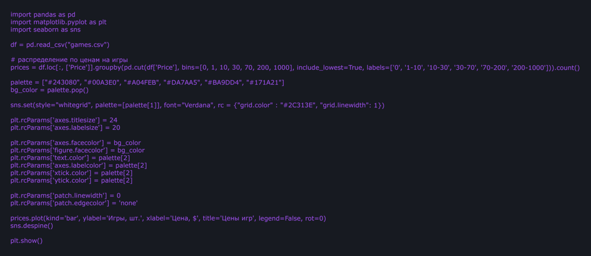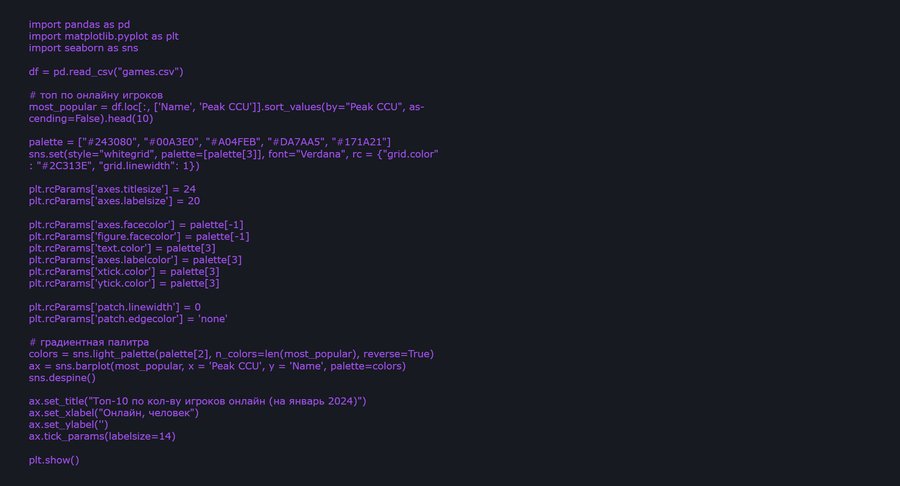 Необходимый датасет с информацией об играх Steam был скачан с сайта HuggingFace. В начале каждой программы я загружаю библиотеки pandas, matplotlib и seaborn и сам датасет.