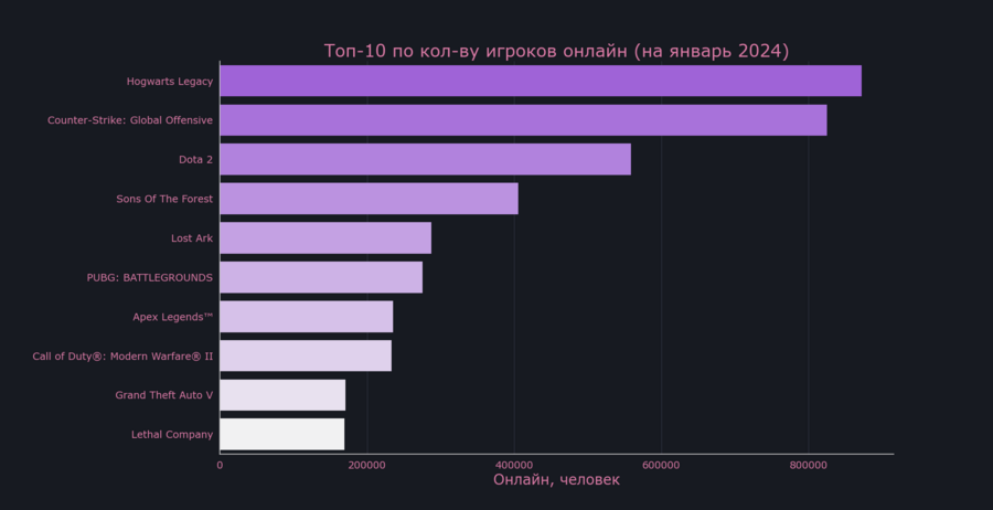 Этот график демонстрирует топ-10 игр, собравших наибольшее количество игроков онлайн на январь 2024 года. С помощью диаграммы мы можем не только проанализировать количество игроков, но и понять, каким может быть верхний порог по сбору онлайн на одной игре.