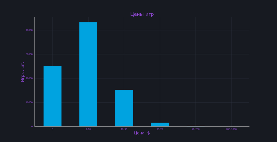 Данная диаграмма анализирует стоимость за игры от низкой ценовой категории до высокой. Благодаря графику можно понять, каких игр больше — дорогих или нет.