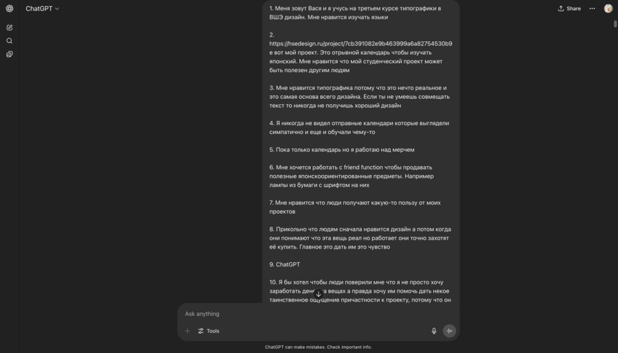 Чтобы нейросеть лучше могла понять мой проект, я предложил провести с ней небольшое интервью.