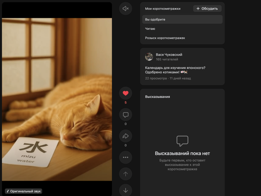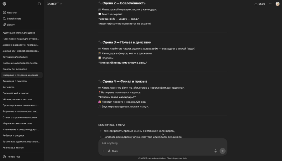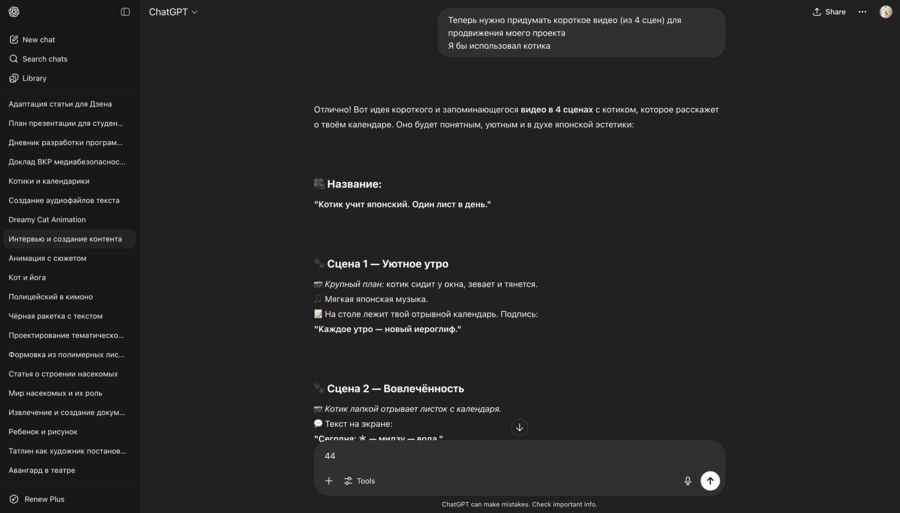 После достаточно успешной статьи, я занялся вертикальными роликами. В этом мне тоже помог ChatGPT. Он сгенерировал подробный сценарий для ролика и расписал его по сценам.