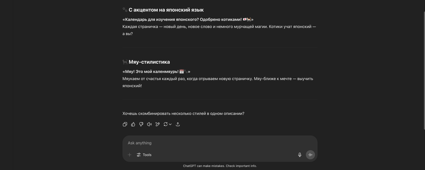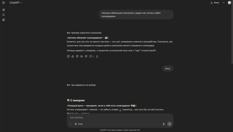 Для текста субтитров меня опять выручил ChatGPT. Он сделал мне подходящую реплику, чтобы продать мой календарь.