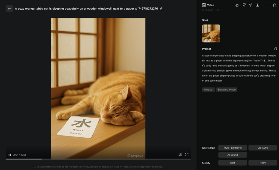 Полученные кадры я по одному загрузил в приложение KlingAI, которое очень долго создавало мне видео, но в конце я получил сырые кадры (даже с похожим под видео звуком!)