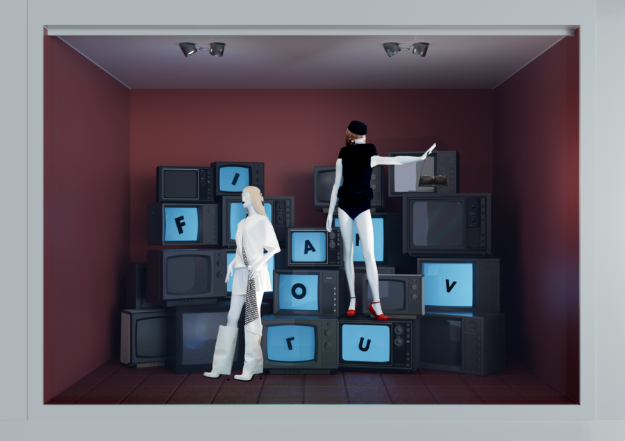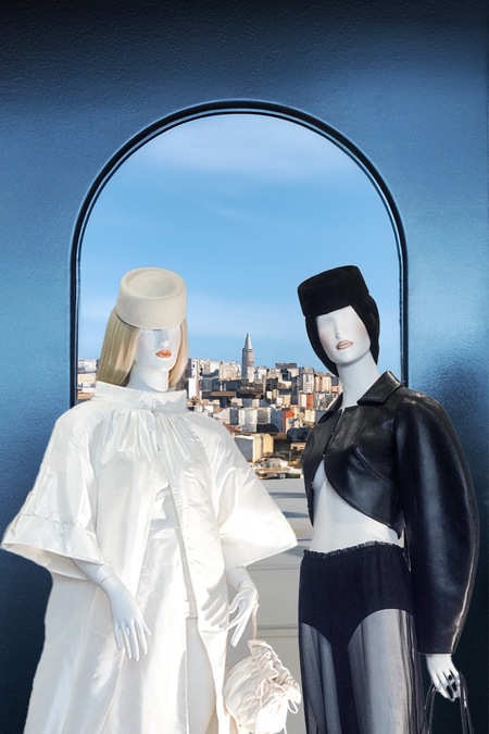Ключевой сочетание в коллекции — формы круга и прямоугольника, которые демонстрируют одежда и обувь. Двойственность же появляется в аксессуарах. Эти формы и число становятся основой серии витрин.