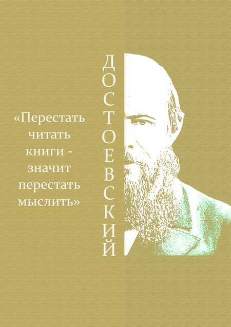 Плакат, посвященный Ф. М. Достоевскому и одной из его цитат, которая, к большому сожалению, сейчас очень актуальна. Мне, как преподавателю, это знакомо «не понаслышке», так как приходится постоянно уговаривать своих студентов почитать: чтение — это неизведанный, огромный мир, в котором невероятно приятно находиться и который чрезвычайно много дает. Тот не читает — лишен этого.