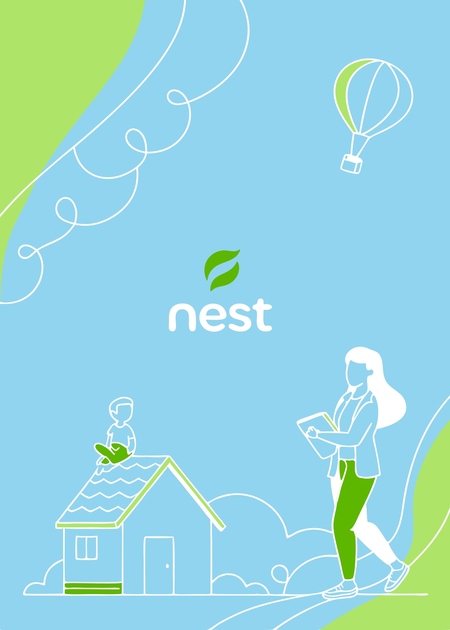 Промпт: Generate a poster for the coworking brand ‘Nest’ focusing on inspiration and freedom. Show a person working in a booth with an open sky above, blending with soft green and blue clouds. Incorporate the tagline ‘Where Ideas Take Flight.’