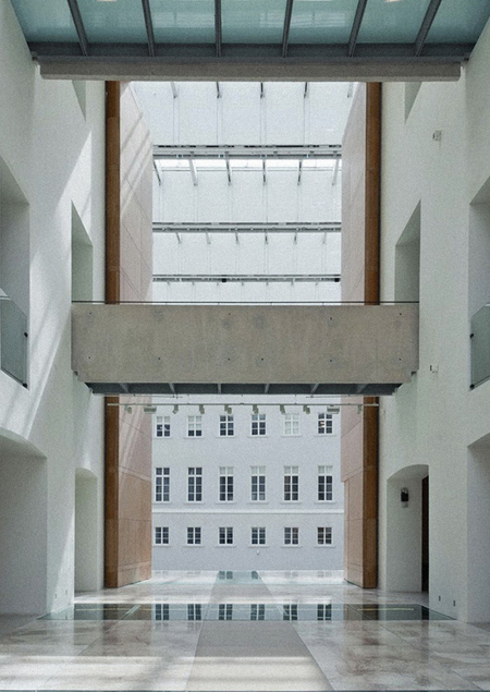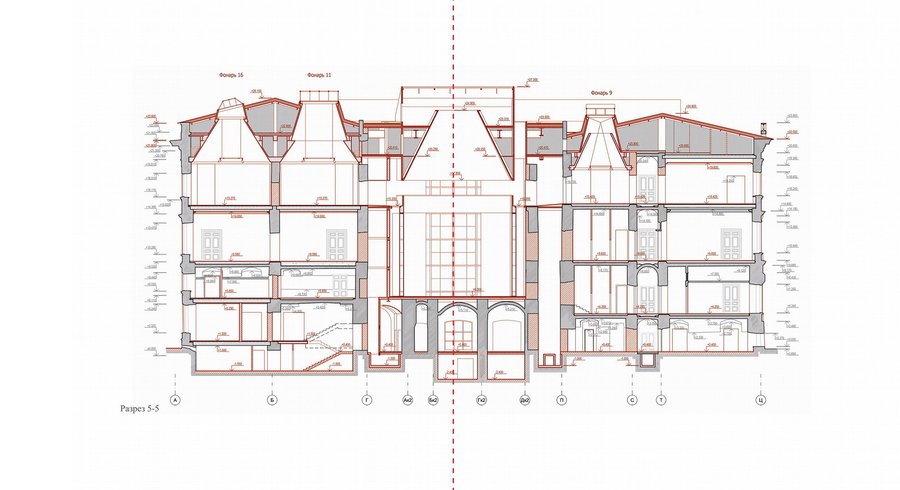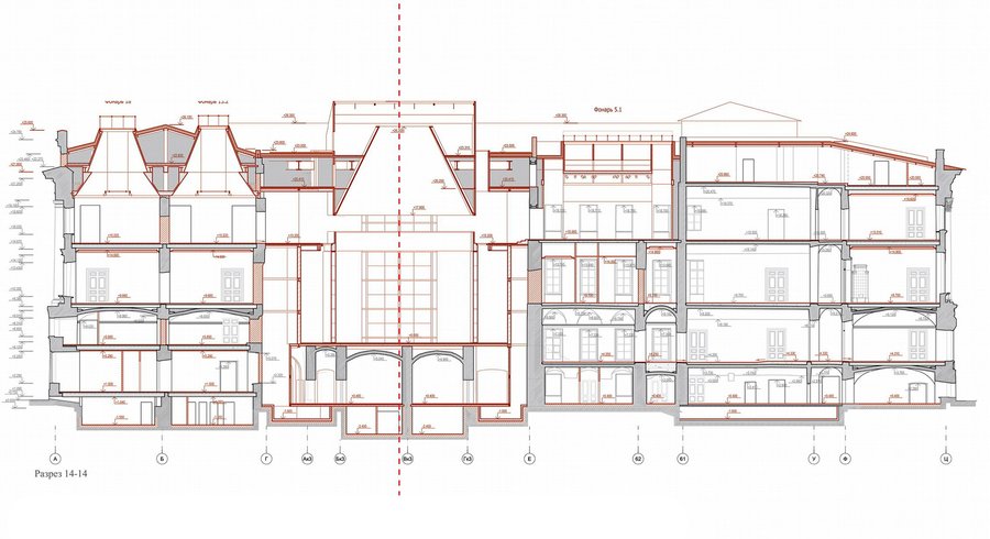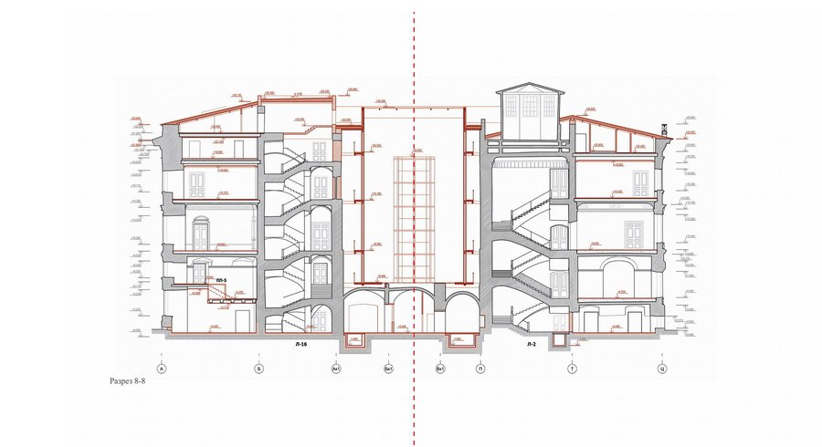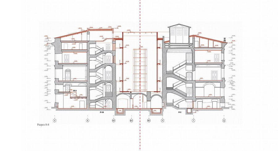 «Сама по себе тема движения посетителей в приспособленном для осмотра памятнике архитектуры довольно часто становится формообразующей идеей для создания стилевых сочетаний старого и нового» (Долгов, 2018)