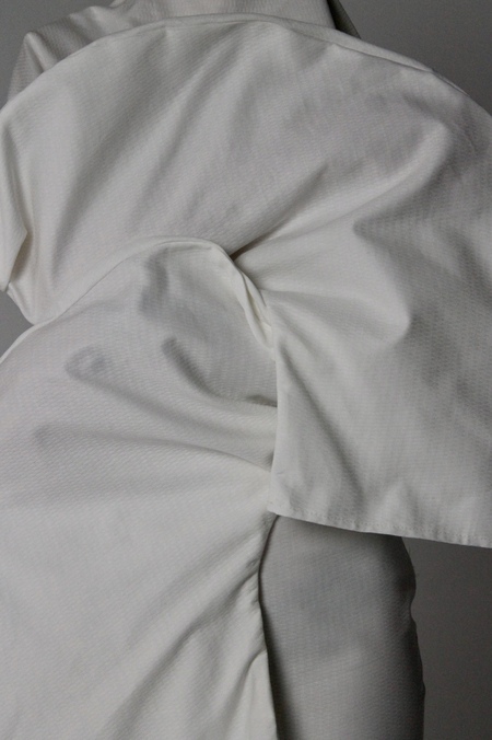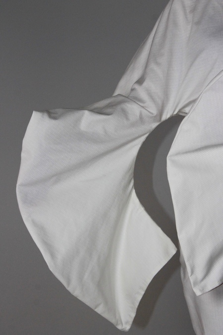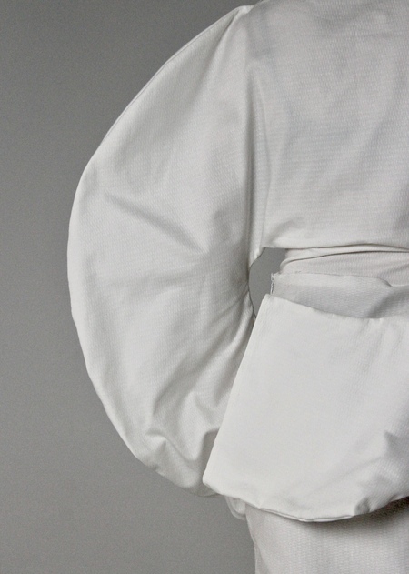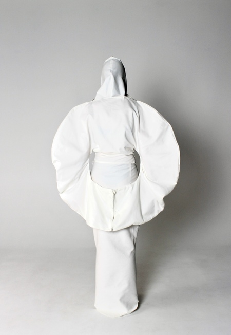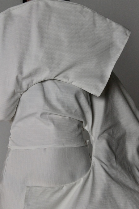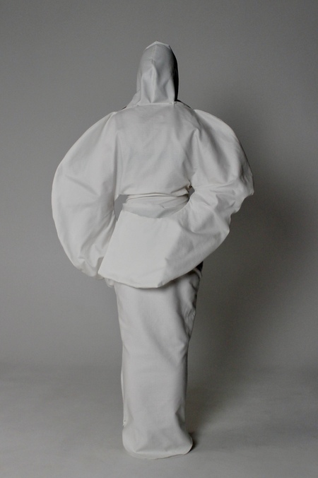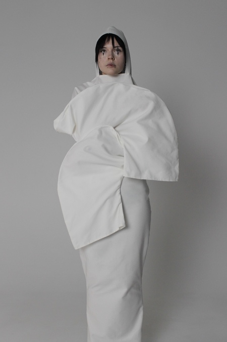 проект исследует тему маски как защиты, которая скрывает личность, но остаётся иллюзией безопасности. образ полностью закрывает человека, создавая ощущение брони, однако его мягкие формы и белый цвет подчёркивают хрупкость этой защиты. объёмные рукава формируют силуэт маски, символизируя двойственность: желание спрятаться и одновременно проявить себя.