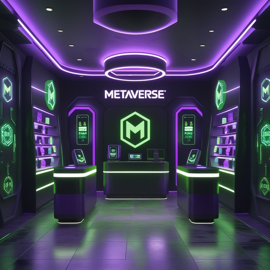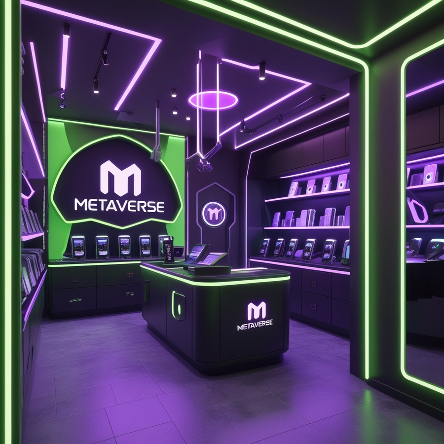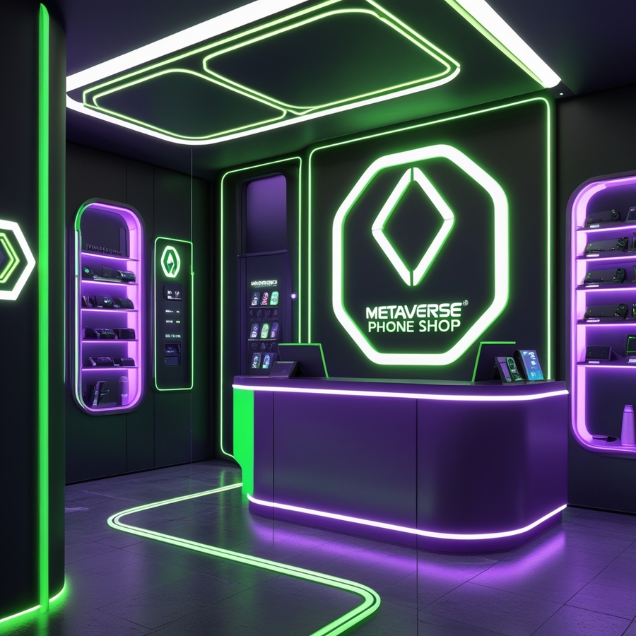 Промт: Interior design of a futuristic phone shop. The interior incoporates neon green and purple colors, with glowing decor. The «METAVERSE» logo should be prominently displayed.