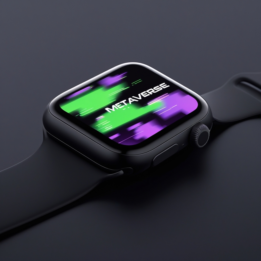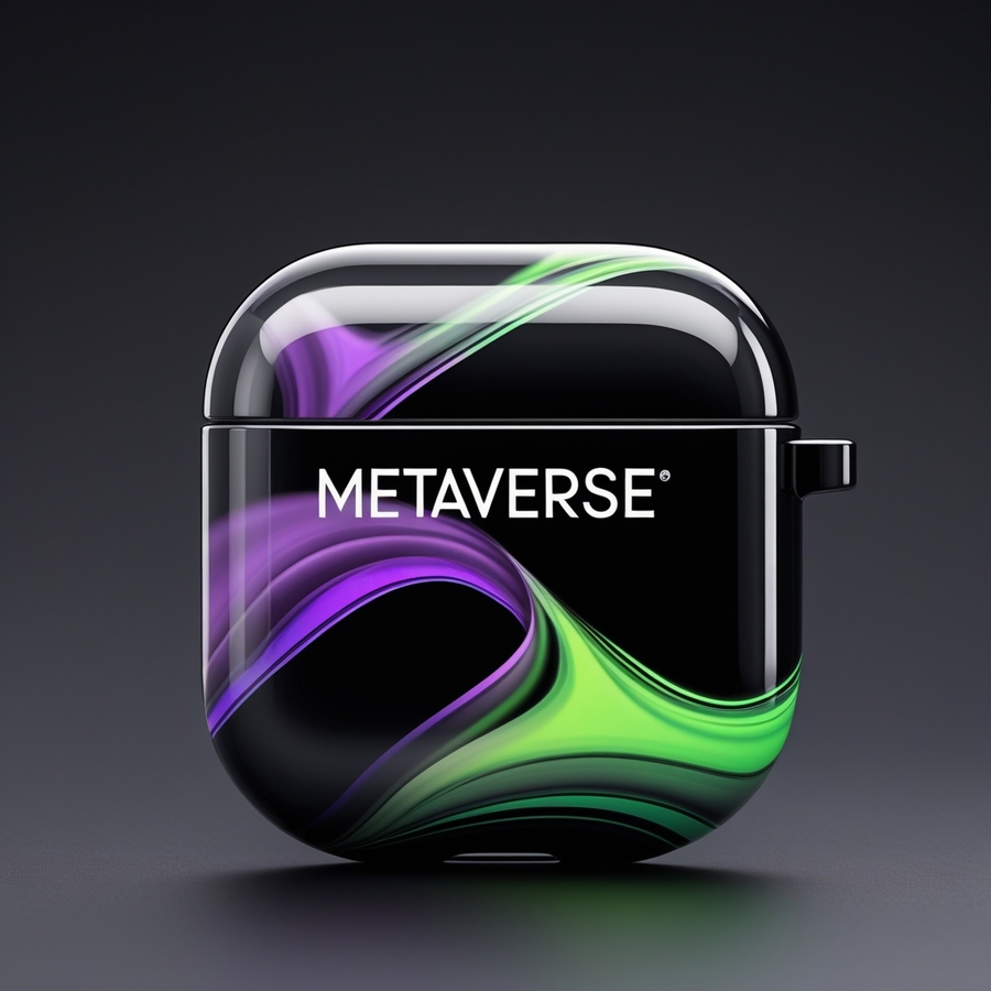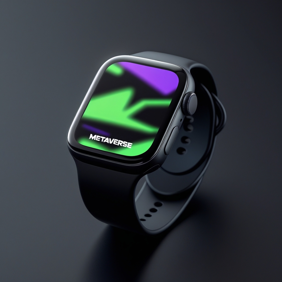 Промты: 1. Futuristic purple headphones with neon green inserts on a dark background. with the «METAVERSE» logo. 2. Minimalistic black smartwatch with neon green and purple blurred abstract shapes on it on a dark background. with the «METAVERSE» logo. 3. Futuristic black wireless headphone case with neon green and purple blurred abstract shapes on its body. with the «METAVERSE» logo.