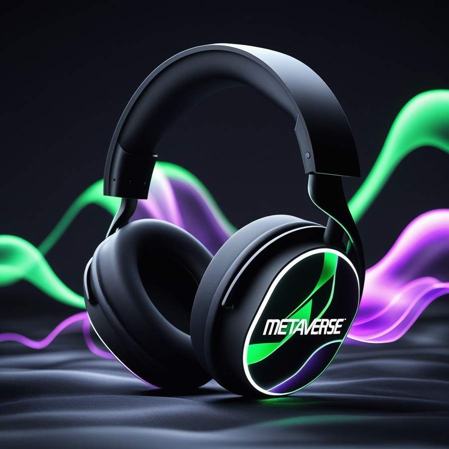 Промт: Poster for a futuristic brand of communication technologies named «METAVERSE», displaying minimalistic black headphones. the backgound of the poster is black and incoporoates blurry abstract shapes in colors of neon purple and green. the logo is minimalistic.