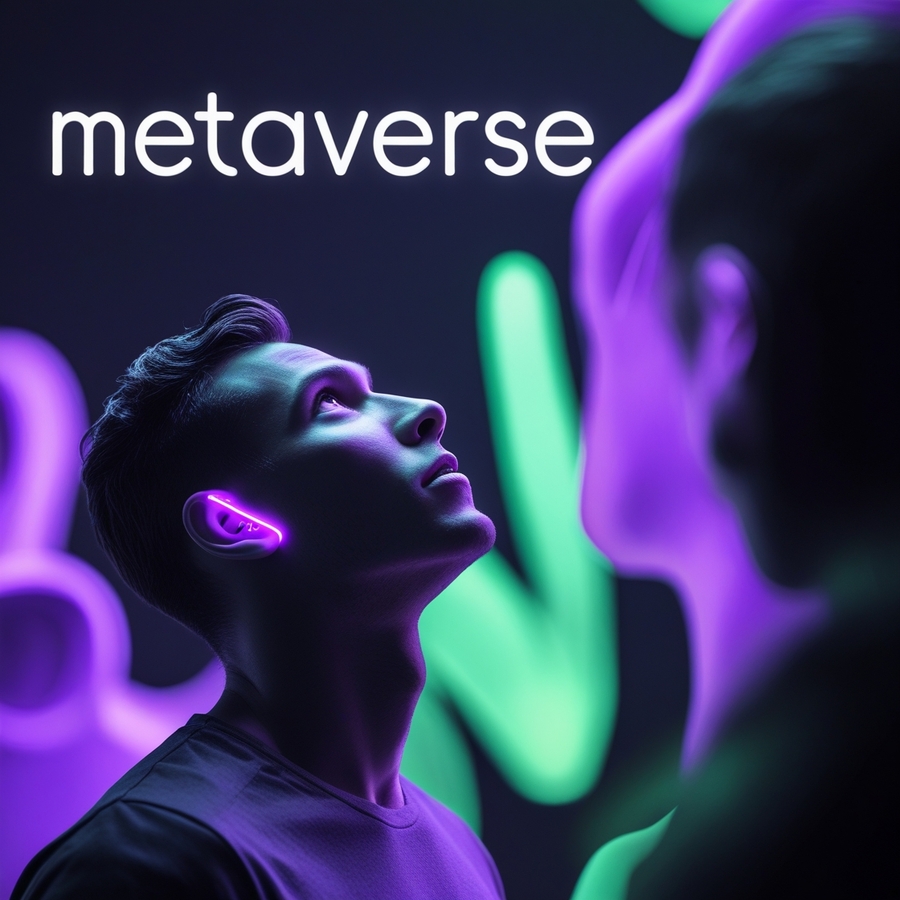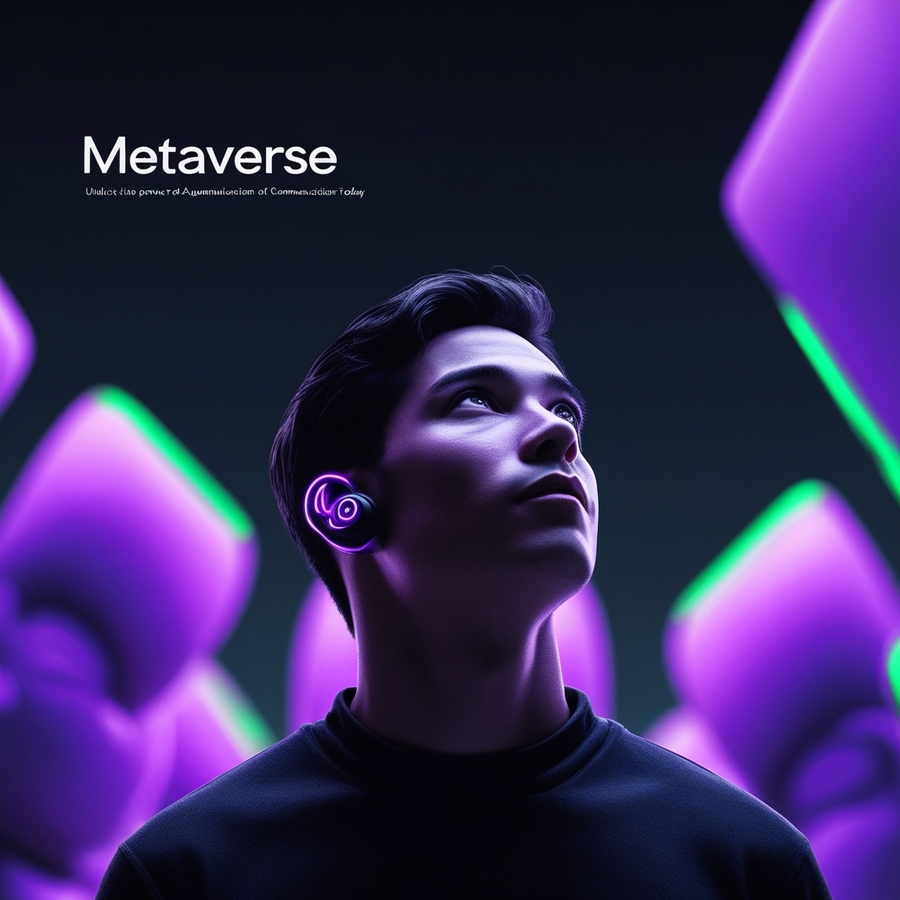 Промт: A dark, futuristic advertising poster for a communication technologies brand, with a simple, modern, and clean «Metaverse» logo in the top-left corner. In the background, blurred abstract figures of neon purple and green colors. In the foreground, a man wearing wireless black earbuds glowing purple. At the bottom of the poster, in small print, the text reads: «Unlock the power of augmented reality, 5G connectivity, and artificial intelligence. Experience the future of communication today.»