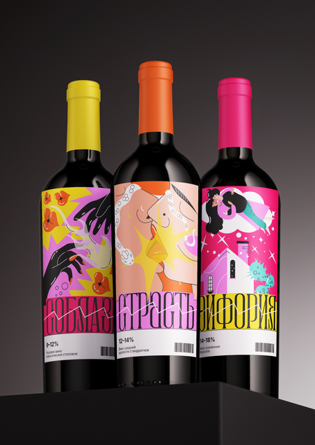 Бренд вин Scintilla обыгрывает именно эту ассоциацию. Вино делится на 5 категорий по уровню крепости — от слабоалкогольного легкого вина до очень крепкого, и, соответственно, по степени раскрепощения — от флирта до экстаза. Проект представляет собой серию из 5 этикеток, иллюстрирующих каждую стадию и крепость вина.