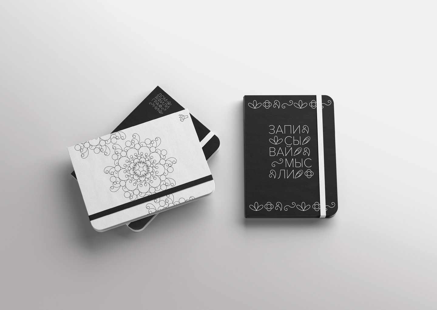 prompt: generate black and white notebooks with a vector pattern of filigree elements. the third notebook is grey, and on it is the inscription in the font philosopher «Filigree thoughts»