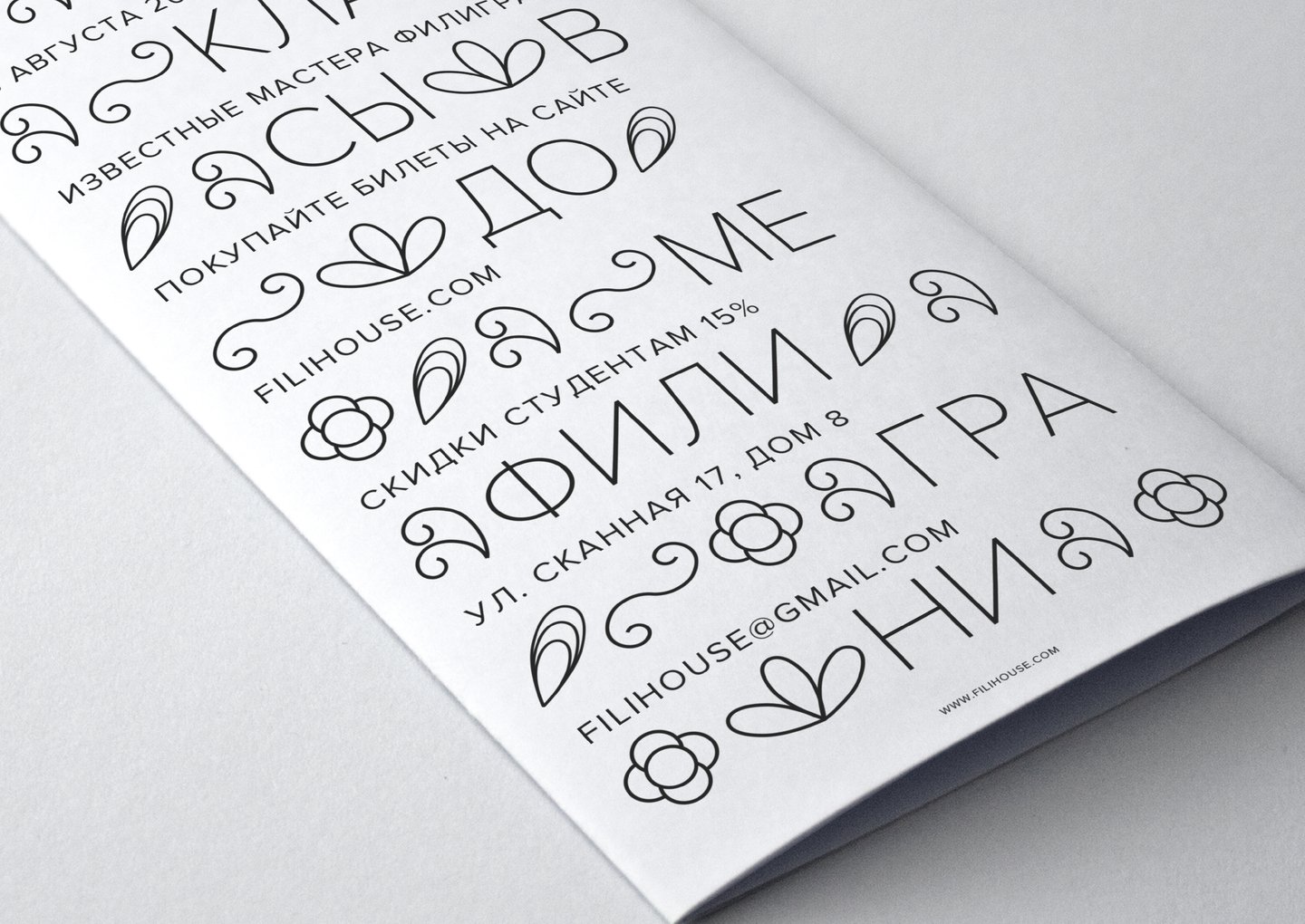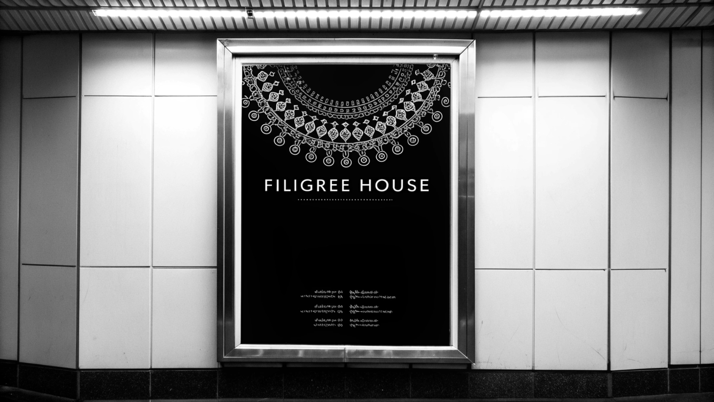 prompt: generate advertising posters using black, white and silver colors. the posters have a vector pattern and inscriptions about filigree. there is also a logo with the name «HOUSE OF FILIGREE»