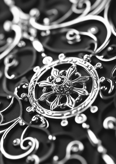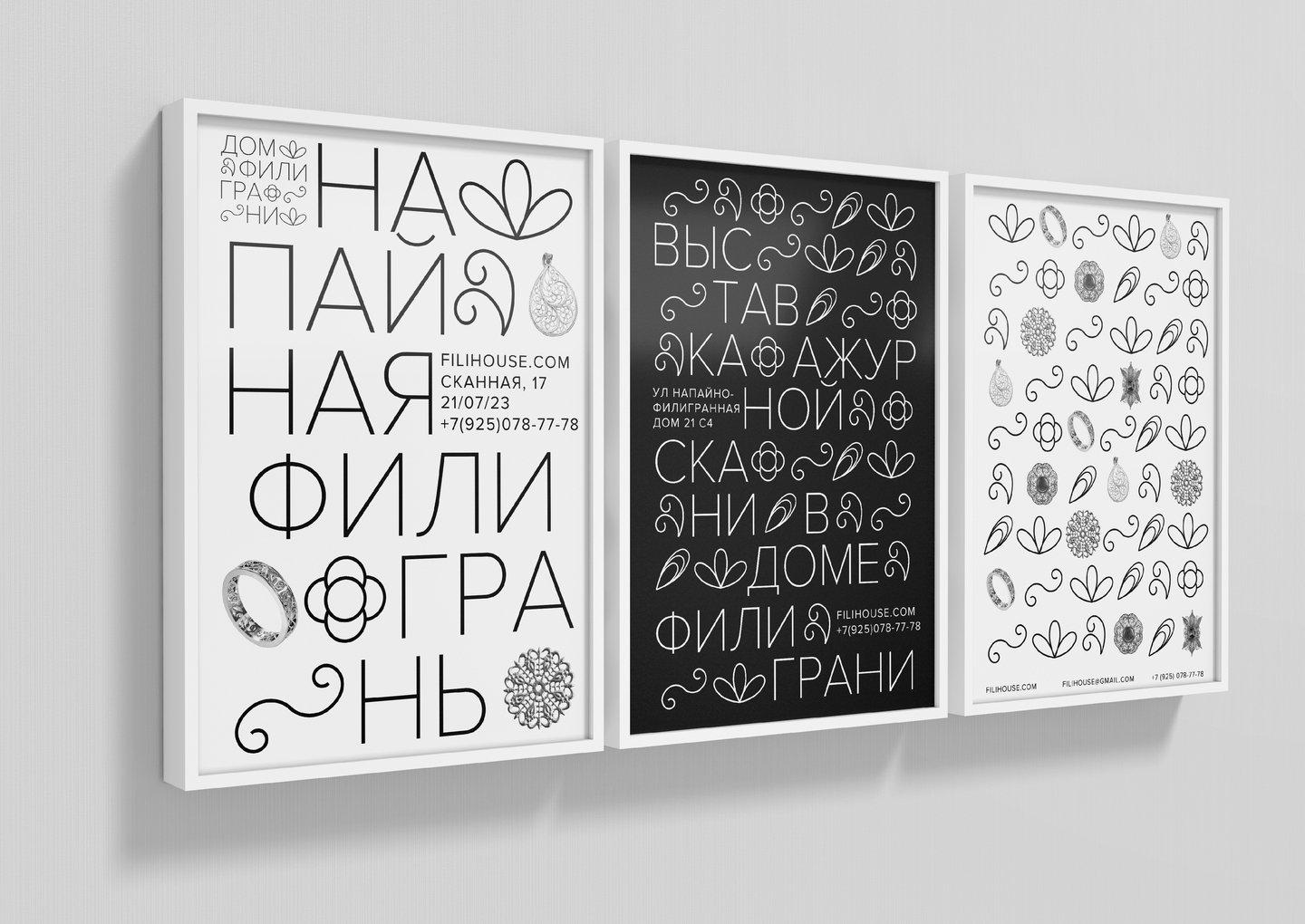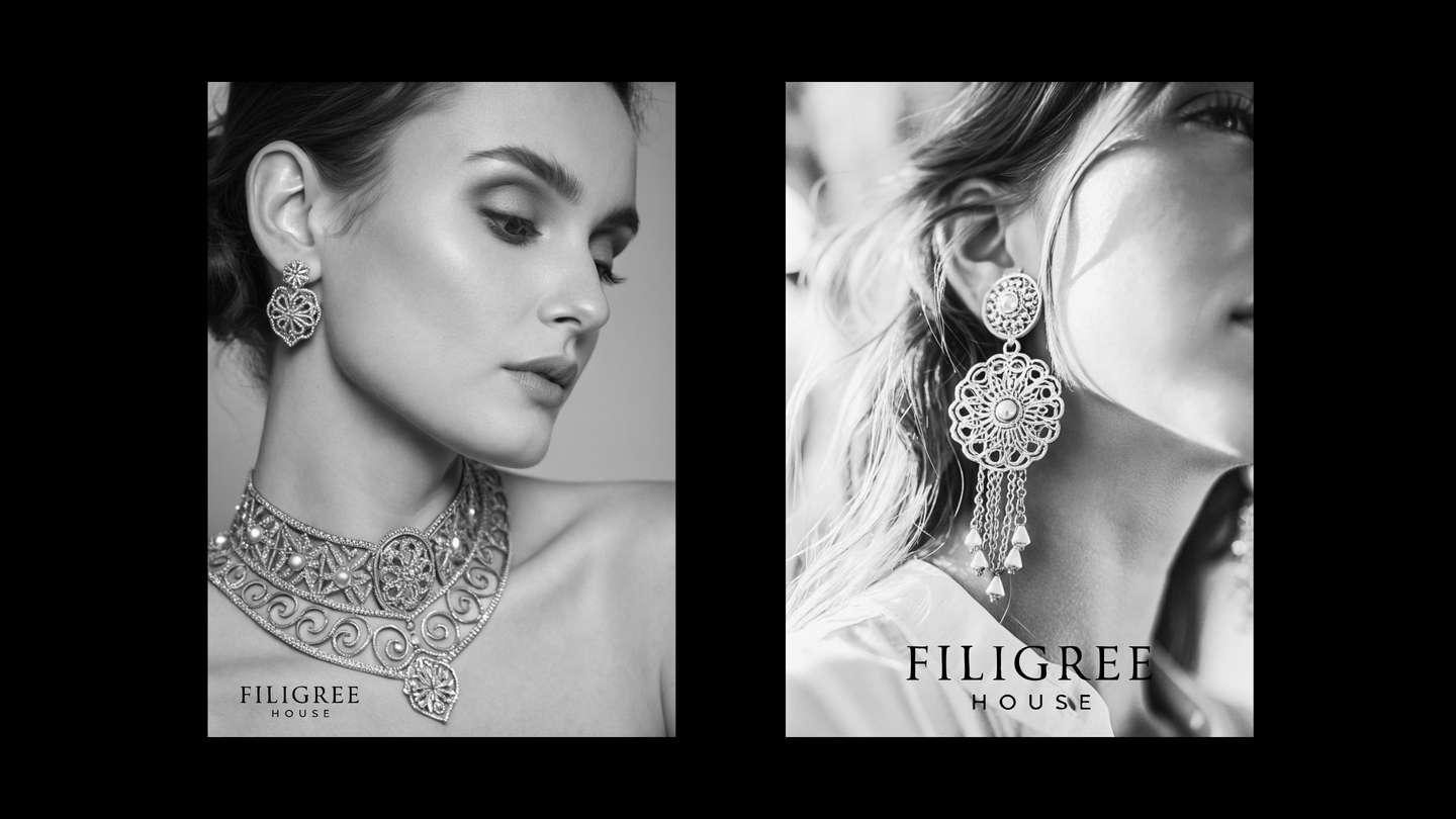 prompt: generate vertical advertising posters using black, white and silver colors. the posters depict jewelry and inscriptions about filigree. there is also a logo with the name «FILIGREE HOUSE»
