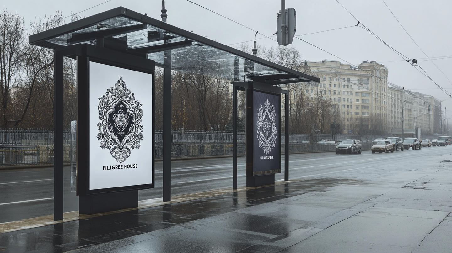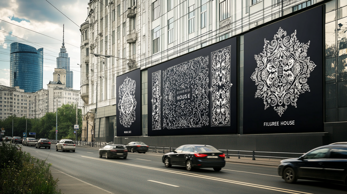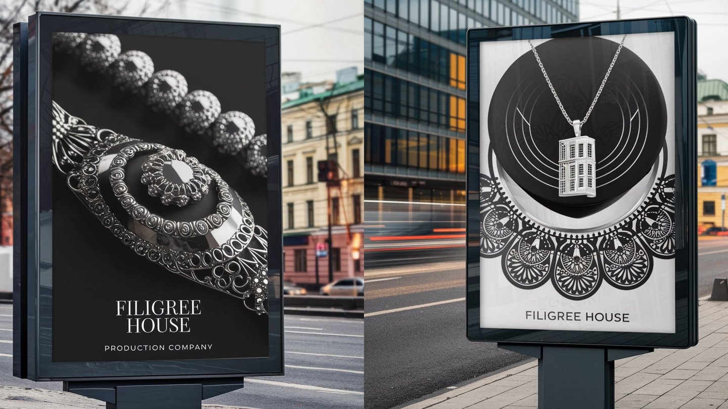 prompt: generate a mockup of filigree jewelry poster for the brand named «FILIGREE HOUSE» production company in the urban Moscow environment on billboards use black, white and silver colors --ar 16:9